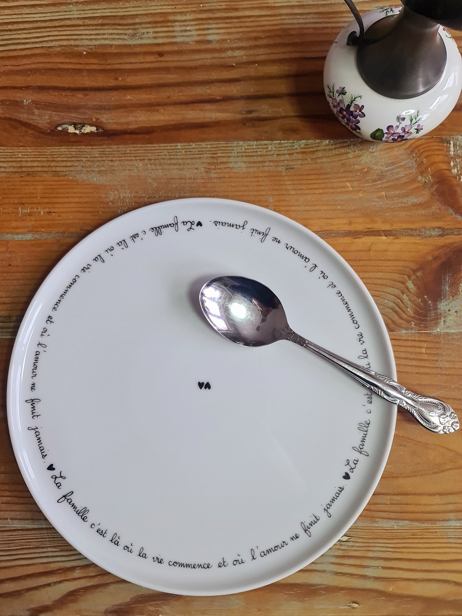 Assiette/Plat en porcelaine - décor Phrase "La famille c'est là où la vie commence et où l'amour ne finit jamais" cœurs peint à la main (Copie)