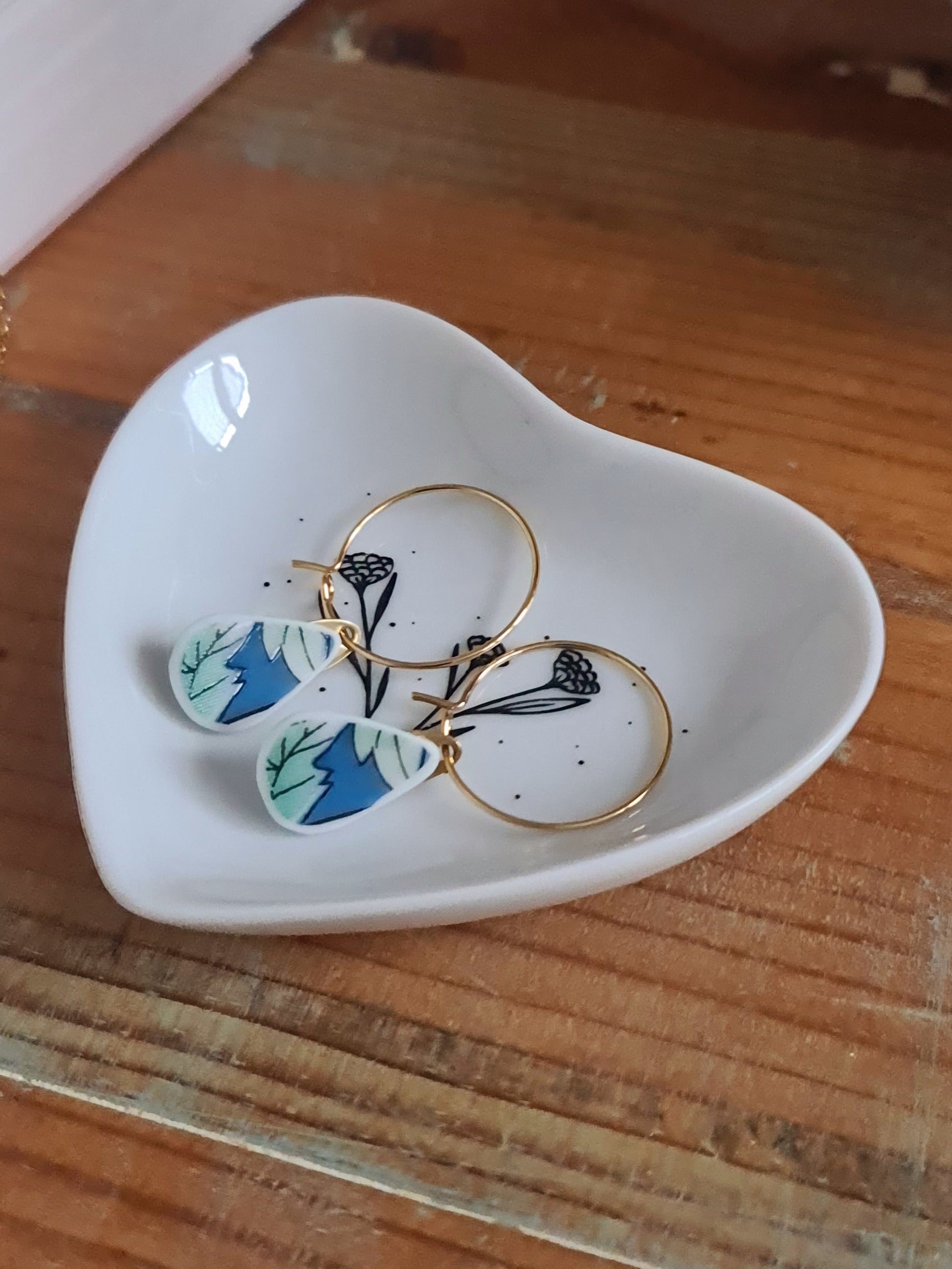 Boucles d'oreilles créoles en acier inoxydable doré - décorées avec un morceau de vaisselle surcyclé - Forme goutte - Feuillage