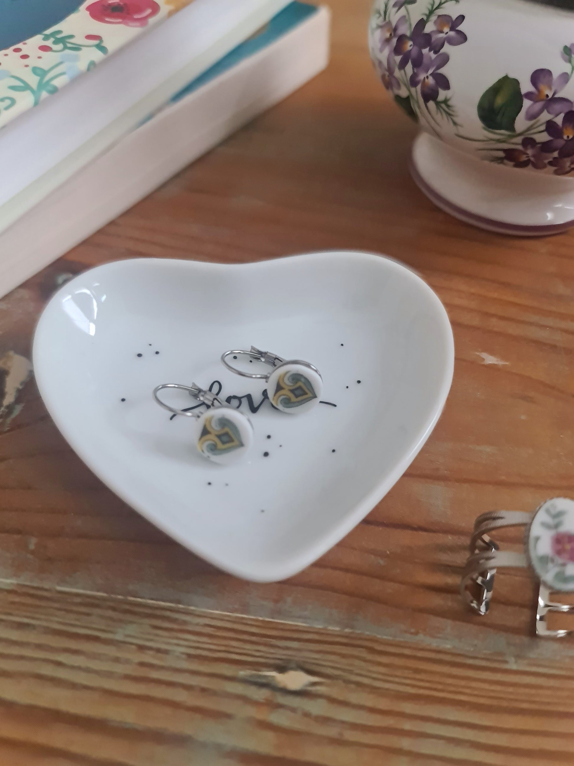 Ces jolies boucles d'oreilles mêlent à merveille la poésie et l'élégance d'un fragment de vaisselle, soigneusement découpé et meulé par mes soins, pour en révéler toute son authenticité.