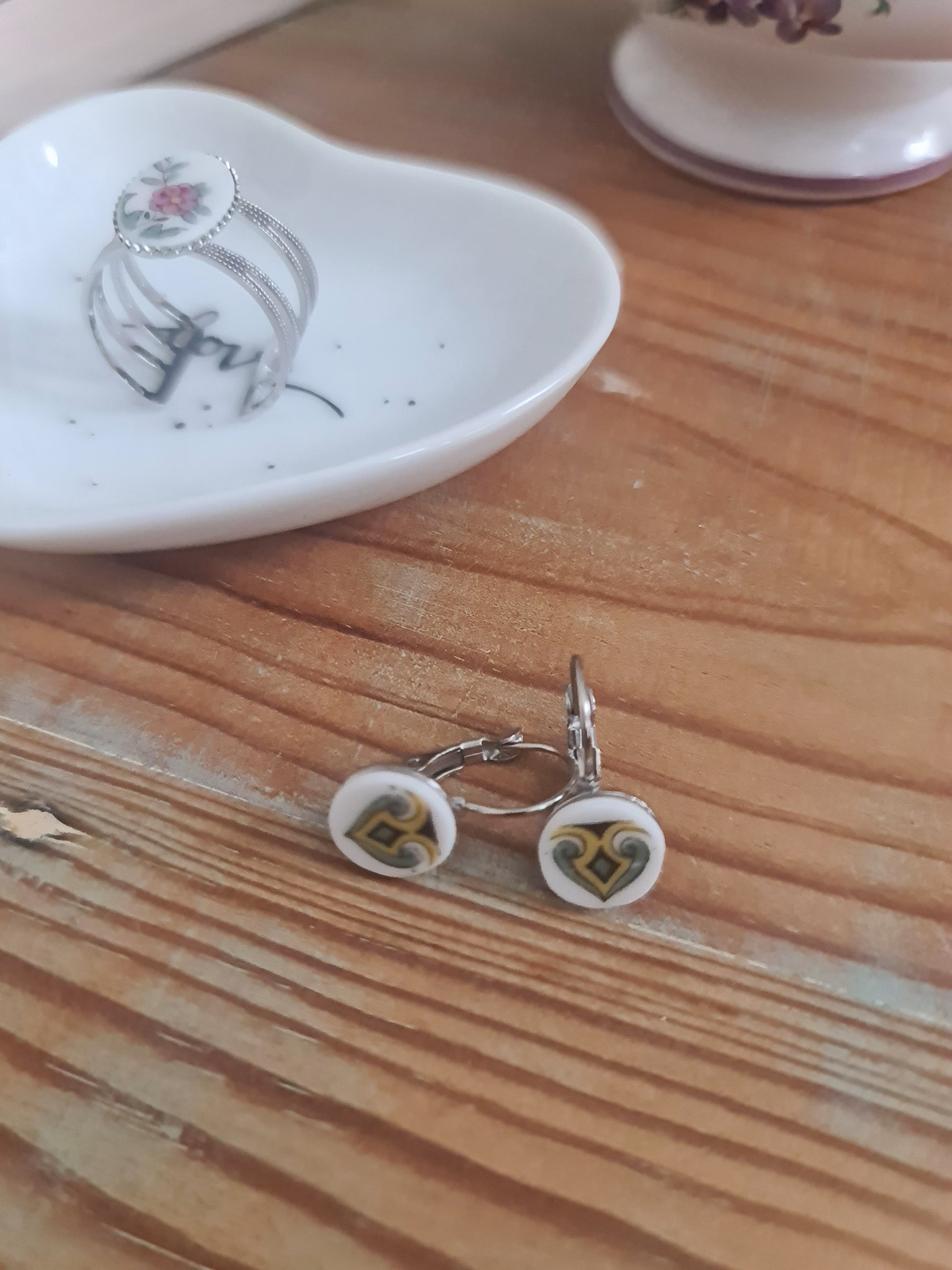 Boucles d'oreilles dormeuses en acier inoxydable - décorées avec un morceau de vaisselle surcyclé - Arabesques