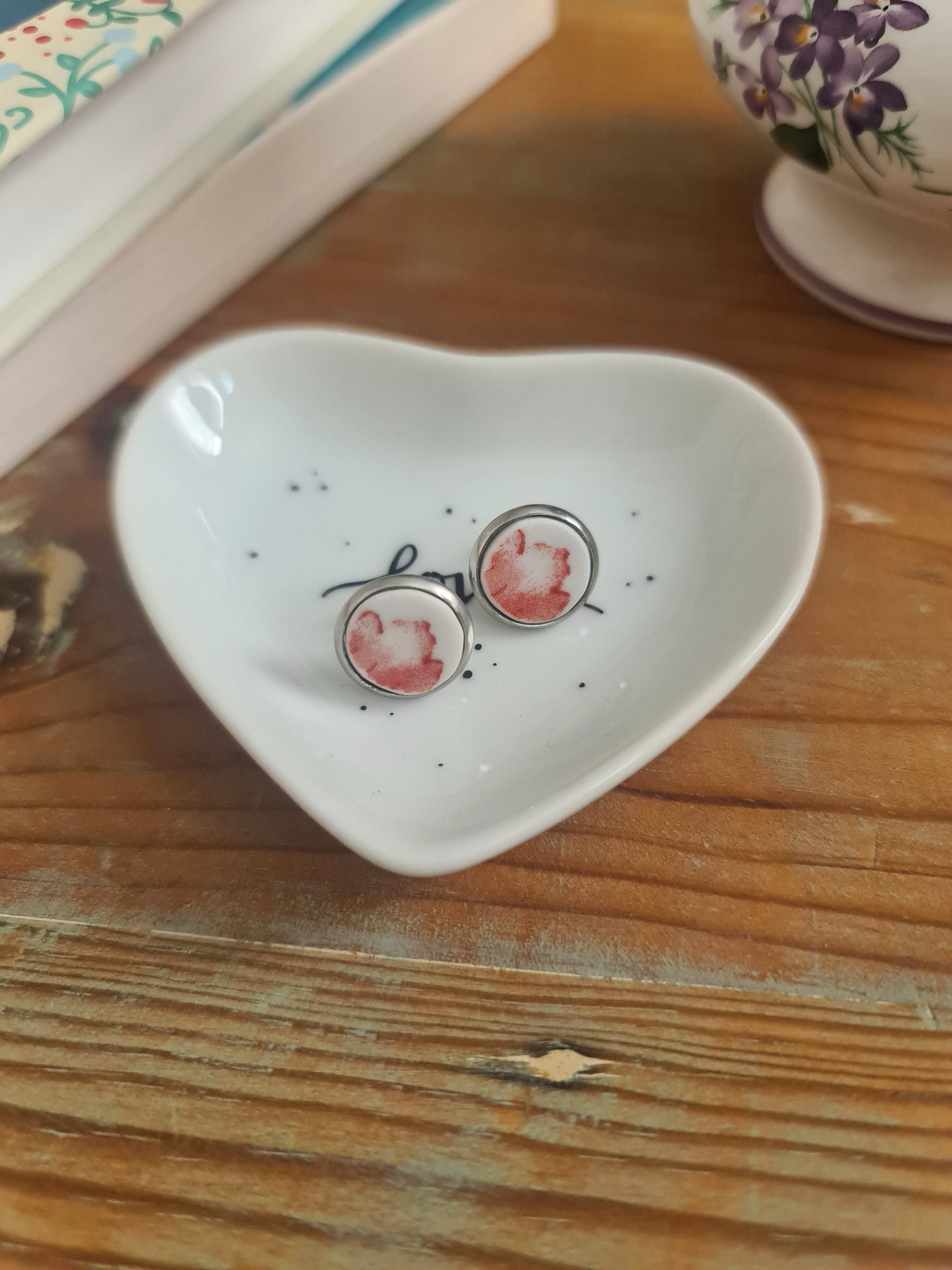 Boucles d'oreilles puce en acier inoxydable - décorées avec un morceau de vaisselle surcyclé - Feuille rouge