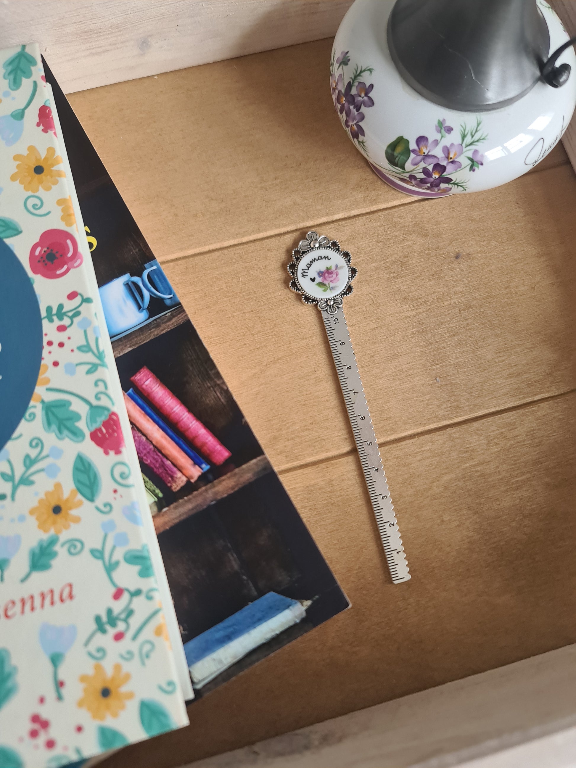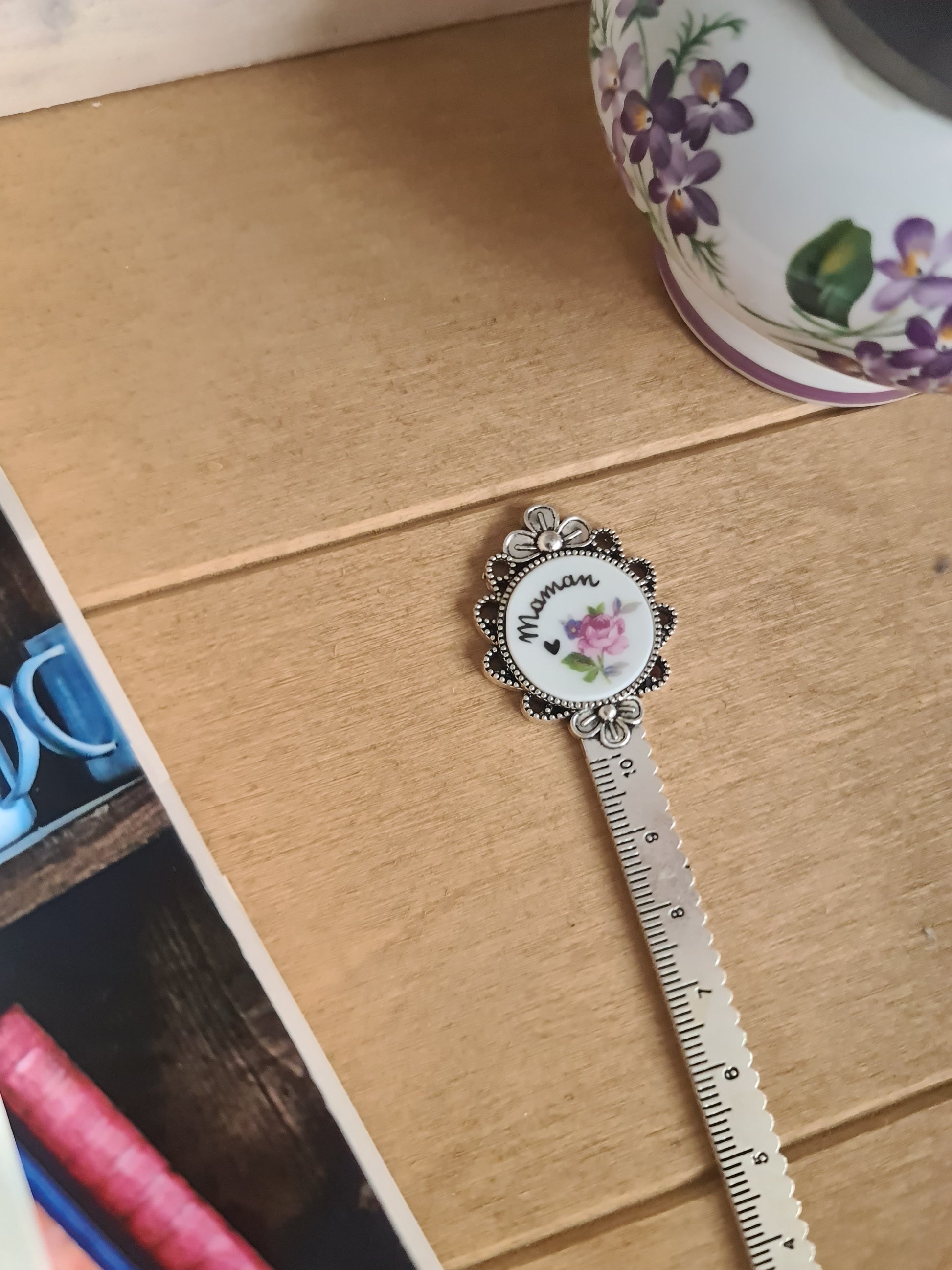 Orné d'un éclat de vaisselle, soigneusement découpé et meulé, puis personnalisé "Maman ♡" par mes soins, ce joli marque page allie élégance et authenticité.
