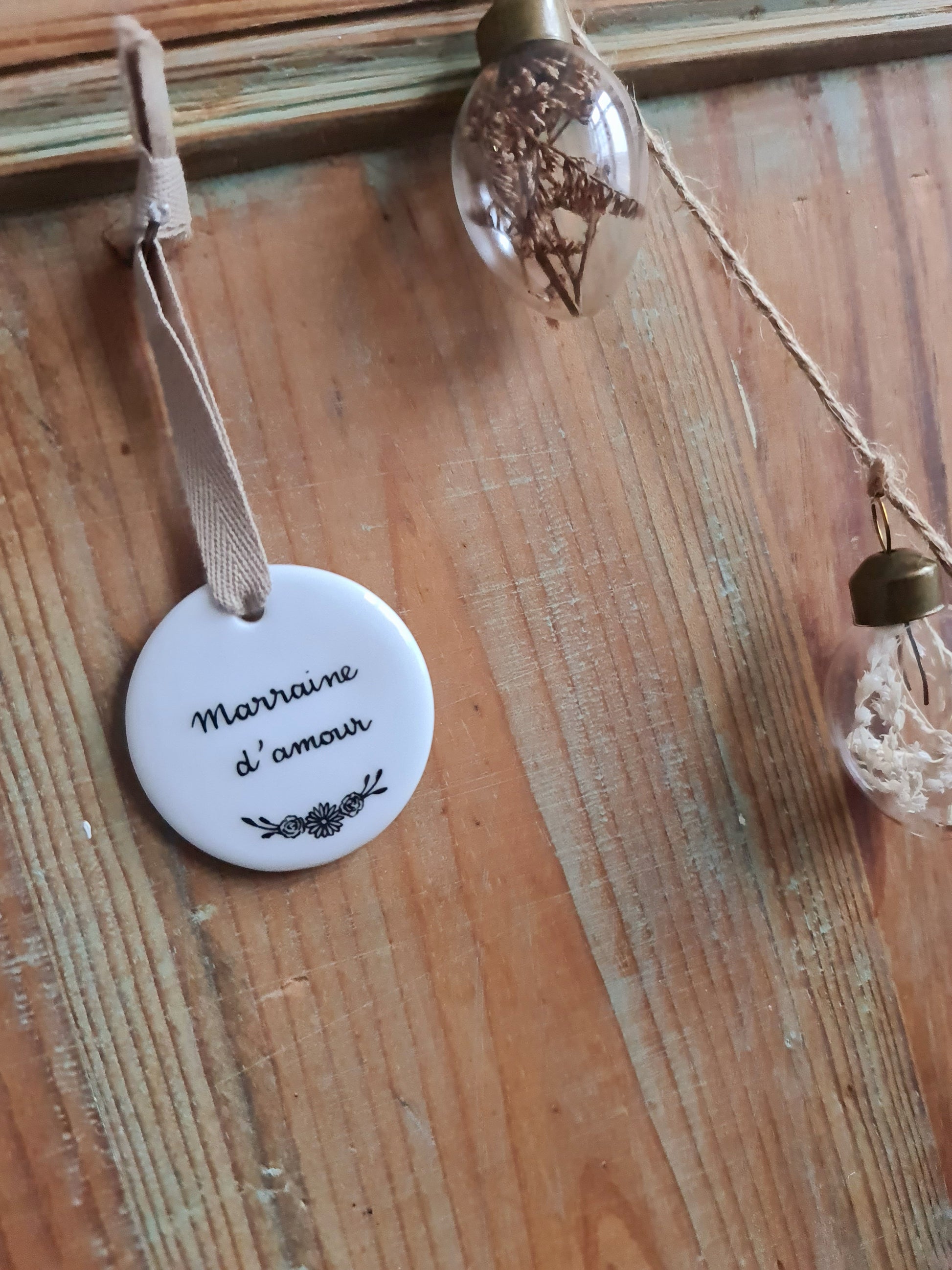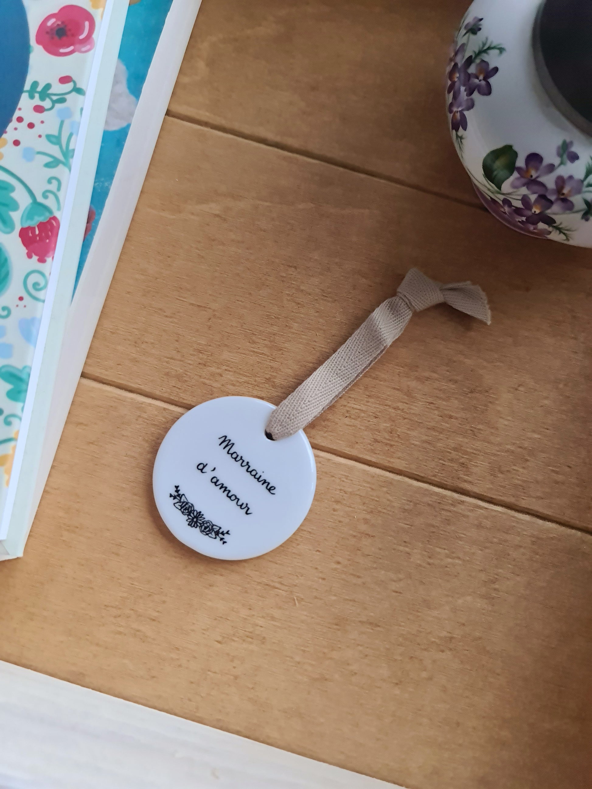 Médaillon rond en porcelaine - décor Marraine d'amour peint à la main